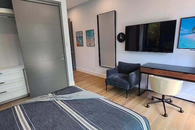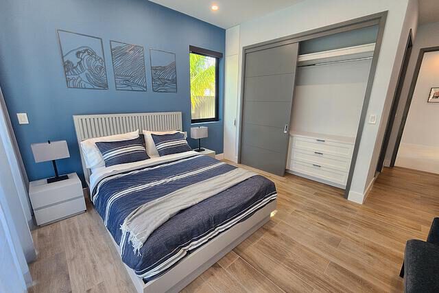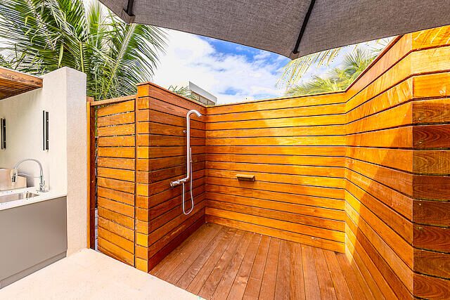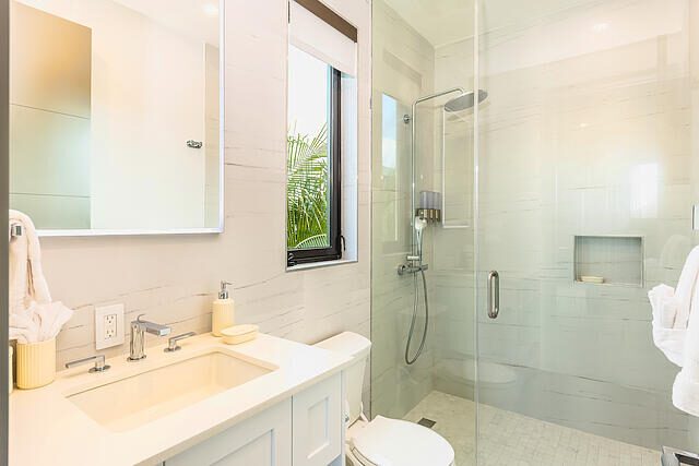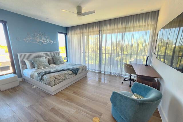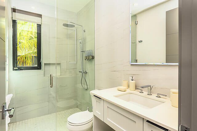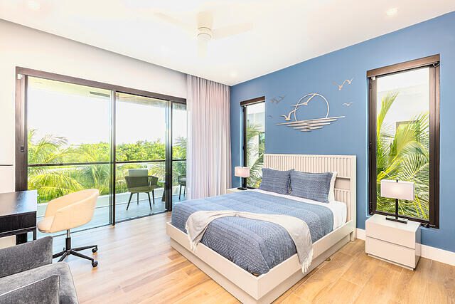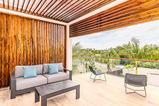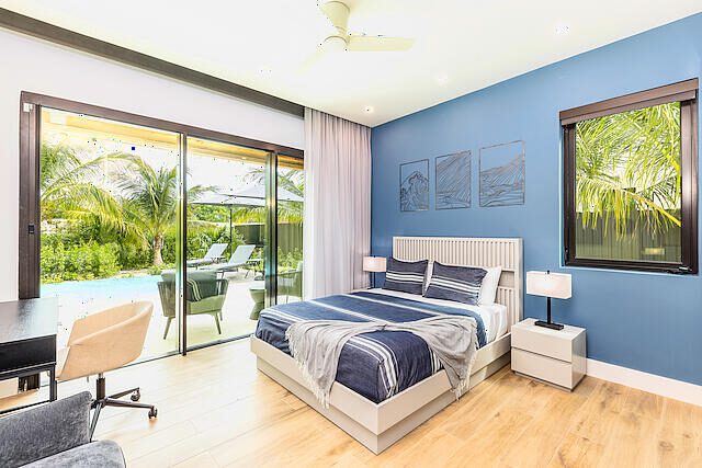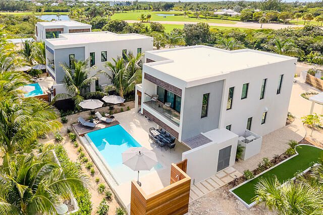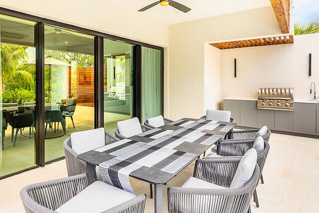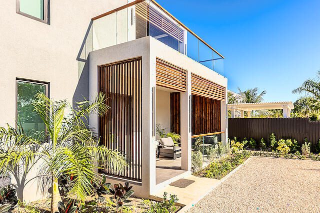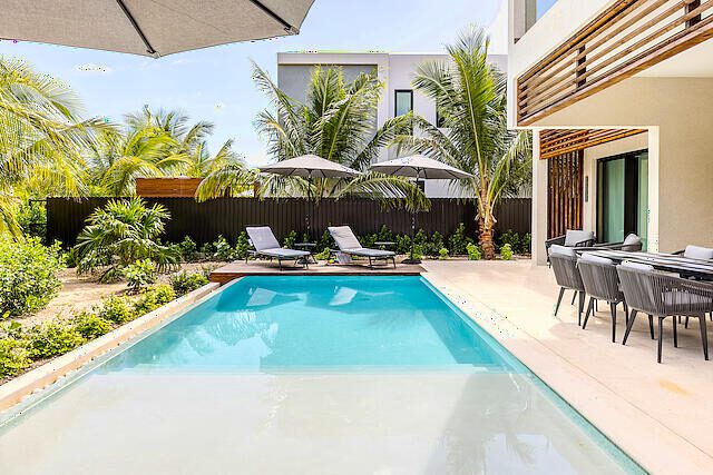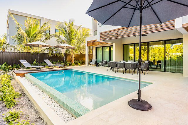 Newly Built beautiful 3 Bedroom, 3 Bathroom Two-floor villa with Pool, Admire the lush landscaping as you walk up to the front door, and step inside the foyer to be greeted with natural light that highlights a beautiful outdoor dining and pool area. The primary bedroom is located on the upper floor and features built-in closets, with a gorgeous en-suite bathroom. The en-suite bath is equipped with a modern vanity, glass door, and rain shower head. Other bedrooms include large sliding doors that open onto the pool terrace or balcony and built-in closets. The living room is perfect for entertaining with its large sliding door that opens onto the pool terrace. This house also includes additional rooms such as a Media Room, Powder, Laundry, AV room, and a pump room on the outside. The house is also equipped with a Gate intercom system and security system giving you peace of mind even when you're away. The exterior features include lush landscaping and curb appeal with a bay-covered parking pergola making this house a sight to behold.